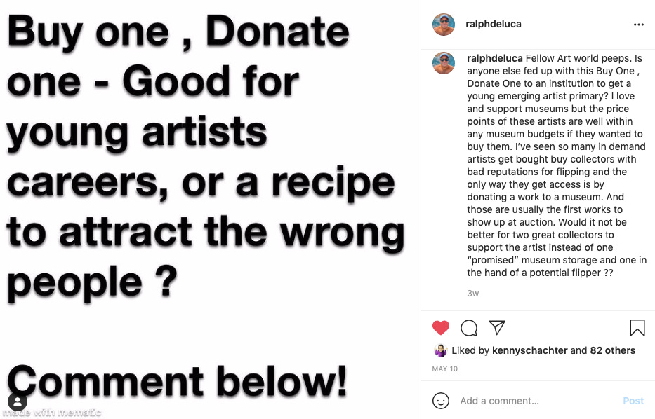 What does this structure of transaction mean for our art and cultural institutions? Galleries are attempting to decrease the friction for a museum to acquire an artwork. At the same time, transactions are changing our institutional infrastructure. Do major galleries staging “museum-quality exhibitions” confer institutional significance? What about art collecting families who start their own private museums? The public and private in art continues to blur, but it always has.